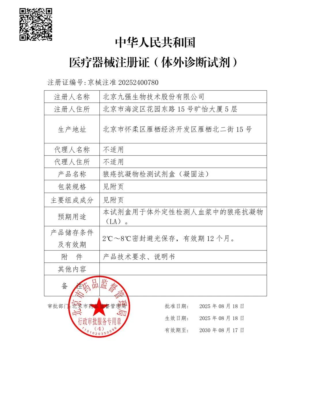 克日,尊龙凯时生物狼疮抗凝物检测试剂盒(凝固法)顺遂取得国家药品监视治理局揭晓的《医疗器械注册证》(注册证号:京械注准 20252400780)。